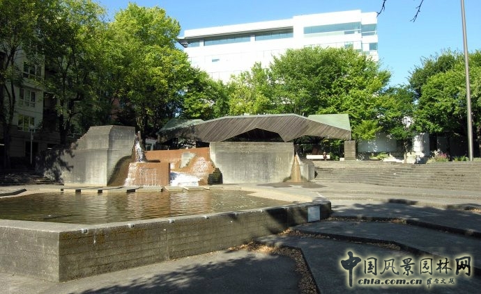 中國風景園林網訊 哈普林最重要的作品是60年代為波特蘭市設計的一組廣場和綠地。三個廣場由一系列已建成的人行林蔭道來連接。愛悅廣場(Lovejoy Plaza)是這個系列的第一站,就如何廣場名稱的含義,是為公眾參與而設計的一個活潑而令人振奮的中心。廣場的噴泉吸引人們將自己淋濕,并進入其中而發掘到對瀑布的感覺。噴泉周圍是不規則的折線的臺地。