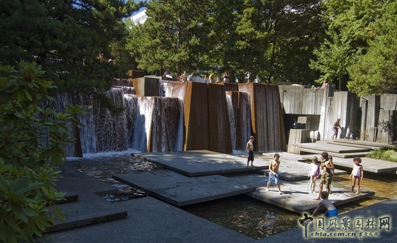 中國風景園林網訊 伊拉·凱勒水景廣場就是波特蘭大市大會堂前的噴泉廣場(Auditorium Forecourt Plaza)。水景廣場的平面近追似方形,廣場四周為道路環繞,正面向南偏東,對著第三大街對面的市政廳大樓。除了南側外,其余三面均有綠地和濃郁的樹木環繞。水景廣場分為源頭廣場、跌水瀑布和大水池及中央平臺3個部分。最北、最高的源頭廣場為平坦、簡潔的鋪地和水景的源頭。鋪地標高基本和道路相同。水通過曲折、漸寬的水道流向廣場的跌水和大瀑布部分。跌水為折線形、錯落排列。水瀑層層跌落,頗得自然之理。經層層跌水后,流水最終形成十分壯觀的大瀑布傾瀉而下,落入大水池中。