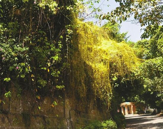 近日,在順慶區(qū)舞鳳山下山通道的道路一側(cè),細(xì)心的市民會(huì)發(fā)現(xiàn),一些原本長勢較好的樹木被一種黃色的植物纏繞、覆蓋,有的樹木已死亡。記者在現(xiàn)場看到,在靠近山體一側(cè)的樹木樹冠上掛滿了黃色的藤蔓,就像被噴上了黃色的彩條,其中較矮的灌木叢更是像被一張黃色的大網(wǎng)覆蓋。