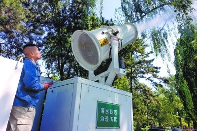 昨天,北京動物園的工作人員利用高壓水炮車噴霧抑制飛絮。