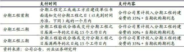 普邦園林作為施工方,按施工進(jìn)度獲得建安工程進(jìn)度款。工程分期驗(yàn)收,每一期交付后,業(yè)主分三期向合作公司支付工程收購(gòu)款,包括「合作公司支付的建安費(fèi)用+投資回報(bào)+建設(shè)期利息+回購(gòu)期利息」。