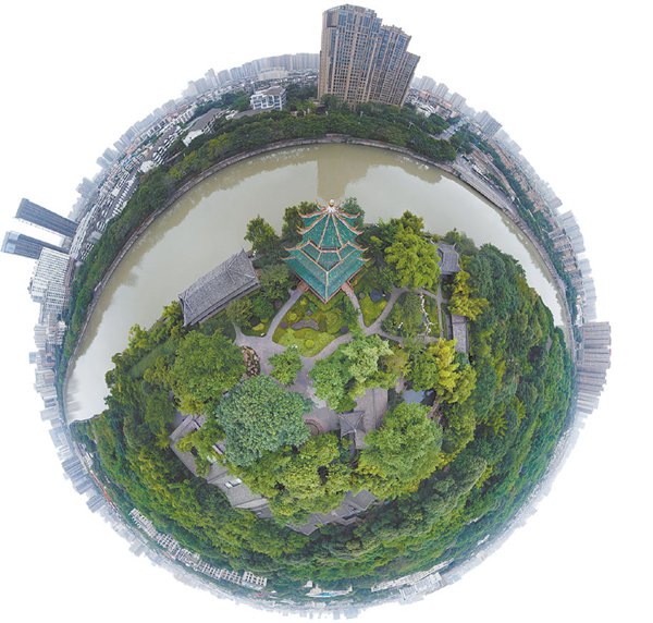 成都市將按照“景觀化、景區化、可進入、可參與”的理念,構建生態區、綠道、公園、小游園、微綠地五級城市綠化體系。圖為鳥瞰望江公園。圖博成都攝影師嚴冬攝