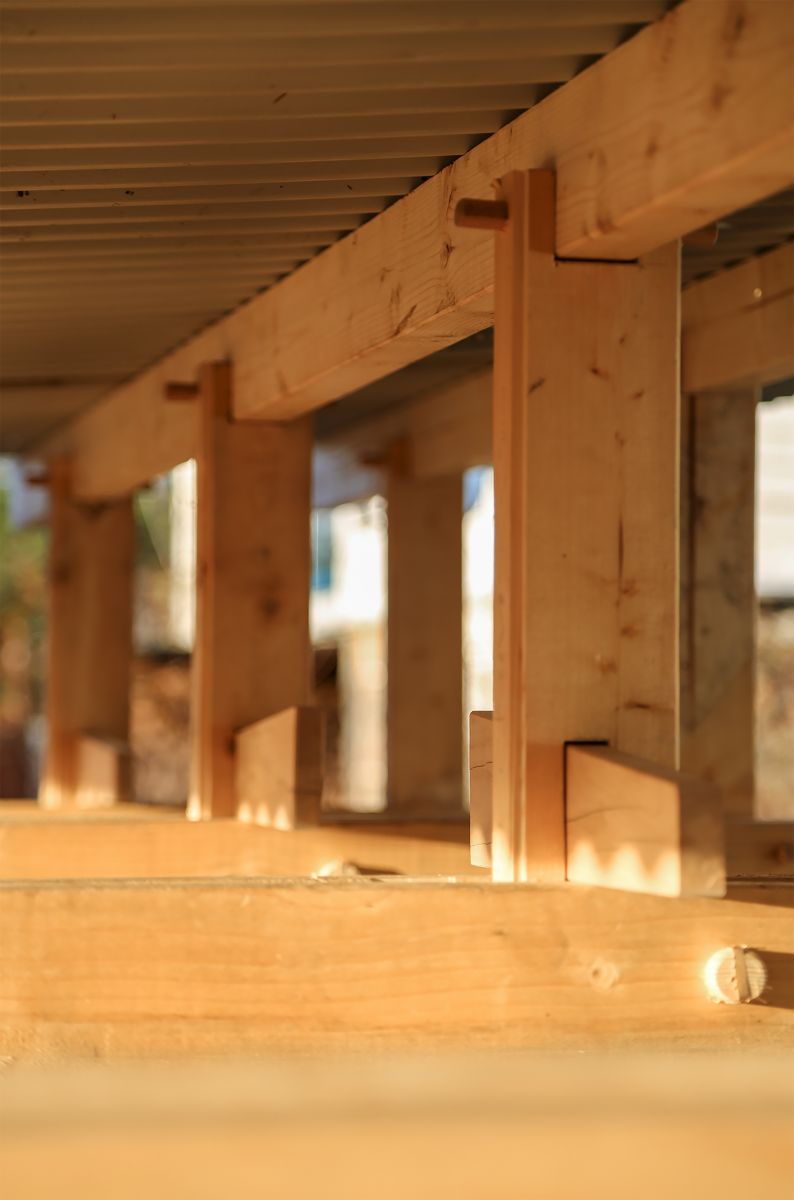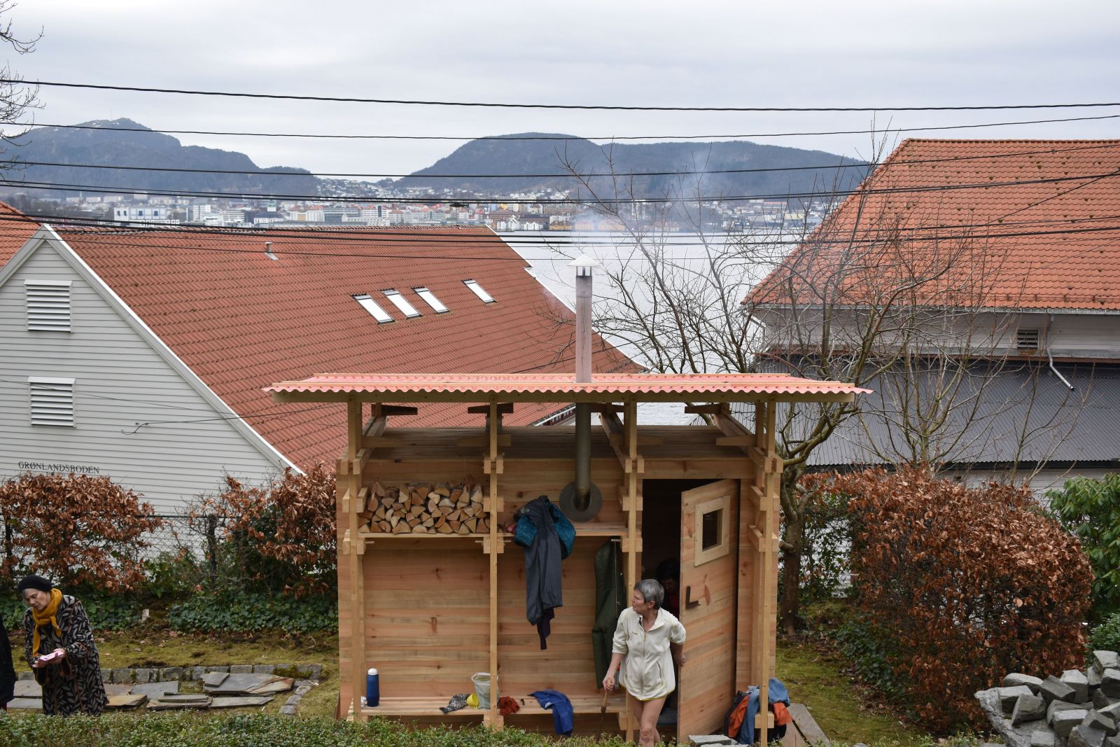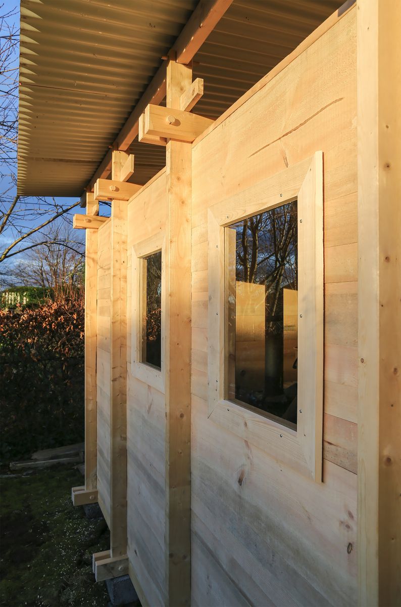 100% wood - As a complete wooden construction, the building is intended to be a furniture and, therefore, uses appropriate joining methods. Instead of nails, screws and glue the main structure is kept together by wooden pegs, wedges and dovetail joints. The sauna consists of a closed core of freshly self-sawn boards, surrounded and stabilized by an outer frame structure made out of dry timber beams. These frames support the lightweight roof made out of reused corrugated metal sheets. The fresh boards are Norwegian pine from the nearby forest on mountain Fløyen. They were sawn into rough-cuts at the Architecture School and later mounted in random widths. The dry spruce of the external structure is standardized timber and also recycled material from a previous task.