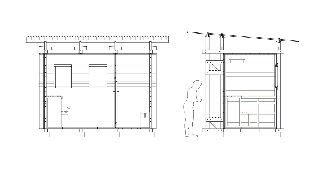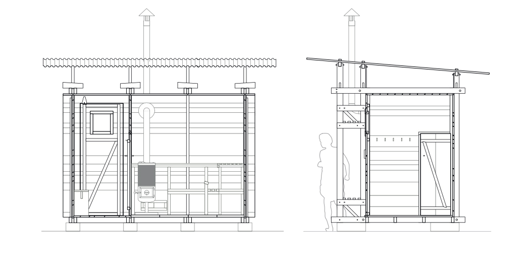 The rectangular floor plan is divided into an entrance area and the sauna room in a ratio of 1:2. The integrated seating and storage spaces on the outer structure offer additional qualities. An inviting entrance door with a small window leads to the changing room including hangers and a bench. A lower door connects the entrance room to the sauna, the low doorframe prevents hot air from escaping. This room is illuminated by two fixed windows and can be ventilated by the help of two ventilation flaps. One flap is mounted low behind the oven for sufficient oxygen supply and the other one is located on the opposite wall below the ceiling to regulate the exhaust air. The floor is made out of concrete panels which on one hand weigh the whole building down and also enable the water to seep through the floor. The L-shaped bench allows the seating on two different levels and includes the granite filled wooden stove. Furthermore, a stainless-steel pipe leads the smoke through the side wall to the outside.