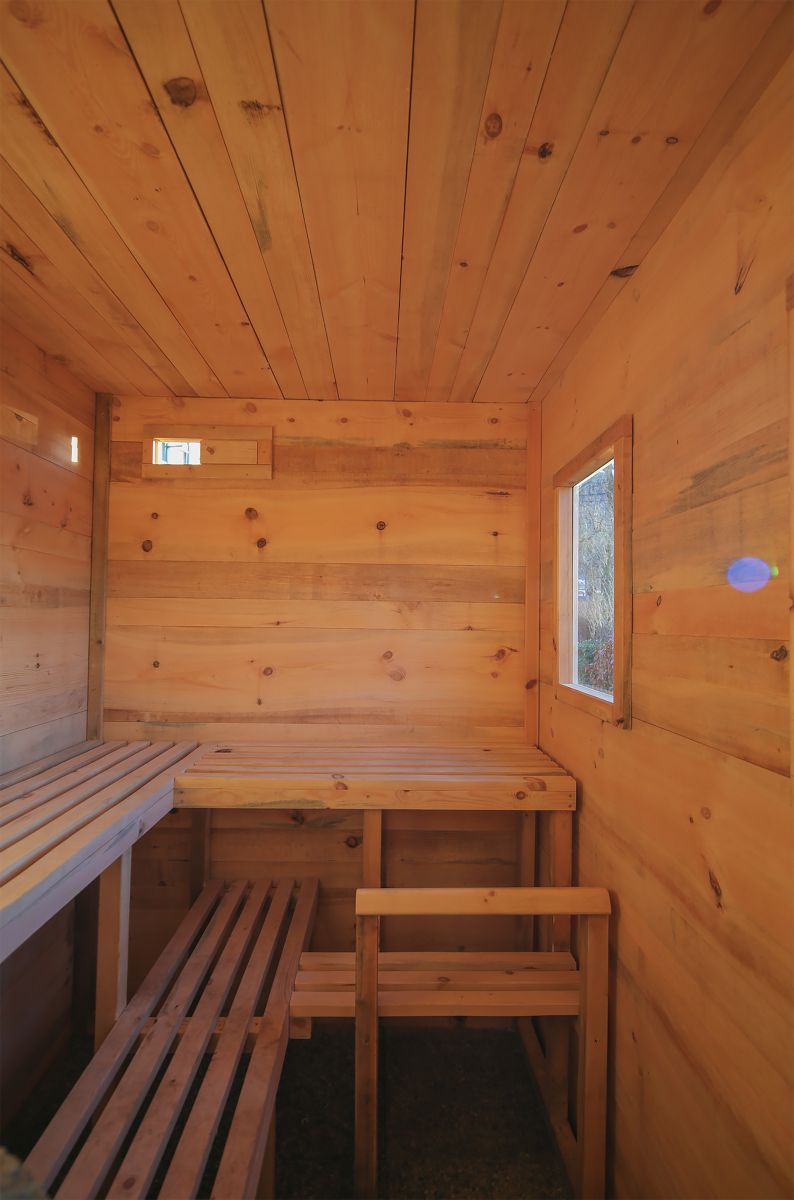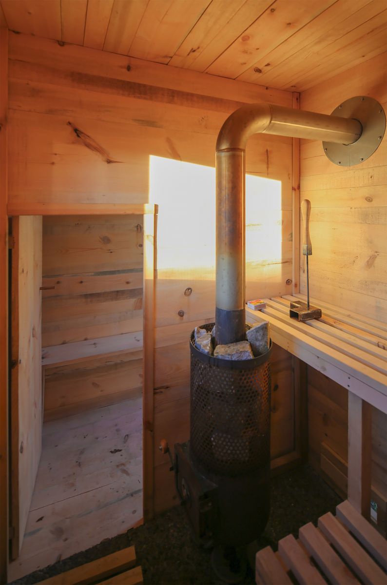 平面圖按照1:2比例分為入口和桑拿室。座椅和儲(chǔ)物空間設(shè)置在了桑拿房外部。更衣室設(shè)有小窗,屋內(nèi)含衣架和長(zhǎng)凳,另外較低的門(mén)進(jìn)入是桑拿房,這個(gè)高度是防止熱氣外散。房間采光來(lái)自兩個(gè)窗戶,借助兩個(gè)通風(fēng)閥來(lái)流通空氣。地板由混凝土板制成,可以整體下壓這個(gè)木屋,另外還可以滲水,L形長(zhǎng)椅設(shè)置成不同的高度,木爐配有花崗巖填充,不銹鋼管將煙氣引到外部。