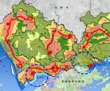 根據(jù)深圳東西長、南北窄的地形特點,自東向西布局了六個功能不同又互為補充的組團(tuán),其間用綠化隔離,同時以三條東西向交通干道聯(lián)系各個組團(tuán)。